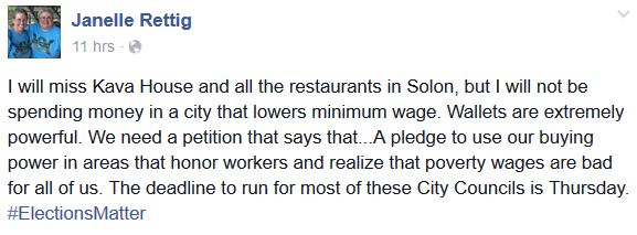 “Solon Council members need to hear the real facts about raising the minimum wage and how this change strengthens our communities,” Misty Rebik, executive director, Center for Worker Justice of Eastern Iowa said in an email last night. “Take action, protect what we’ve won.”