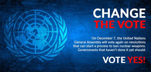 “Each December, the First Committee resolutions goes to the full General Assembly for a second vote,” Beatrice Fihn, ICAN executive director wrote in an email. “The four key resolutions (humanitarian consequences, humanitarian pledge, ethical imperatives and open-ended working group) will be voted upon again on Dec. 7. This is a great chance for us to improve the voting results from First Committee and a good opportunity to put additional pressure on some governments.”
