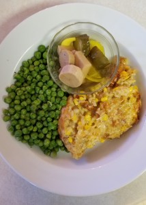 Our garden and interaction with local food sources make the kitchen part of the garden. I made a simple supper of corn-rice casserole, steamed peas and a dish of home made pickles (onions, cucumbers and daikon radishes). Such meals go well in our household because they taste good with leftovers to be heated up for another meal.