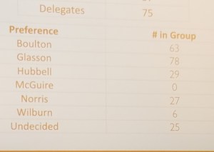 There were three preference group alignments and those viable after the second selected delegates to the district and state conventions in the third. The image shows delegate counts after the first alignment. It took 37 delegates to maintain viability. After the second alignment there were three viable groups. They elected district and state delegates as follows: Glasson (27), Uncommitted (25) and Boulton (23). Our Norris group joined Hubbell and Uncommitted delegates and sent nine of our delegates to the next level. Hubbell did likewise and Uncommitted took the balance.