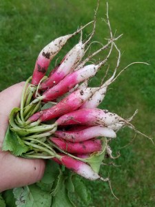 Harvest is ramping up with d’Avignon radishes, spinach, cilantro and chives heading to the kitchen.