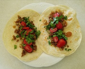 Using pantry ingredients — storage onions, garlic, recipe crumbles, salt and home blended seasonings — I made a filling. I cooked tortillas in a large frying pan, and finely cut cilantro stems and ribboned the leaves. I topped the filling with halved grape tomatoes from California and fresh cilantro, which made the dish.