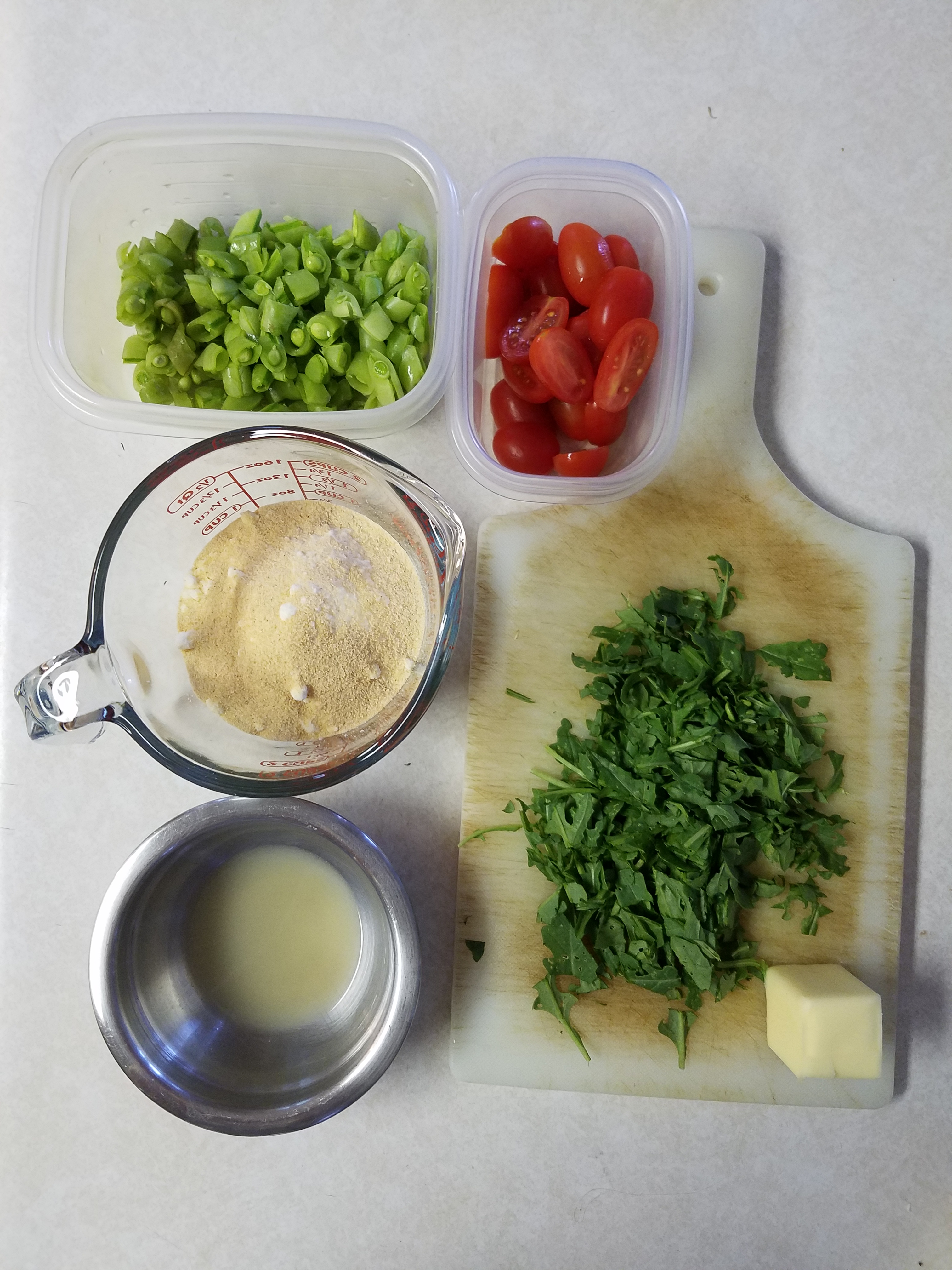 Cut ten grape tomatoes in half and set them aside. We get grape tomatoes from the warehouse club, although the first flowers are appearing on the tomato plants in the garden. It won’t be long before we have home grown cherry and grape tomatoes.