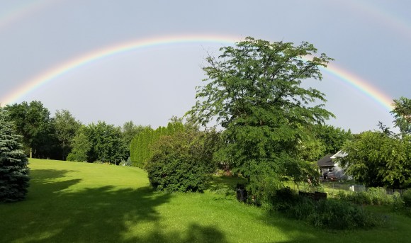 Realizing there might be a rainbow I rushed upstairs and looked out an east-facing window. I saw a double rainbow framing the garden plots and our back yard.