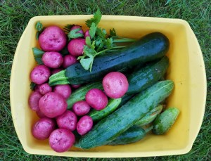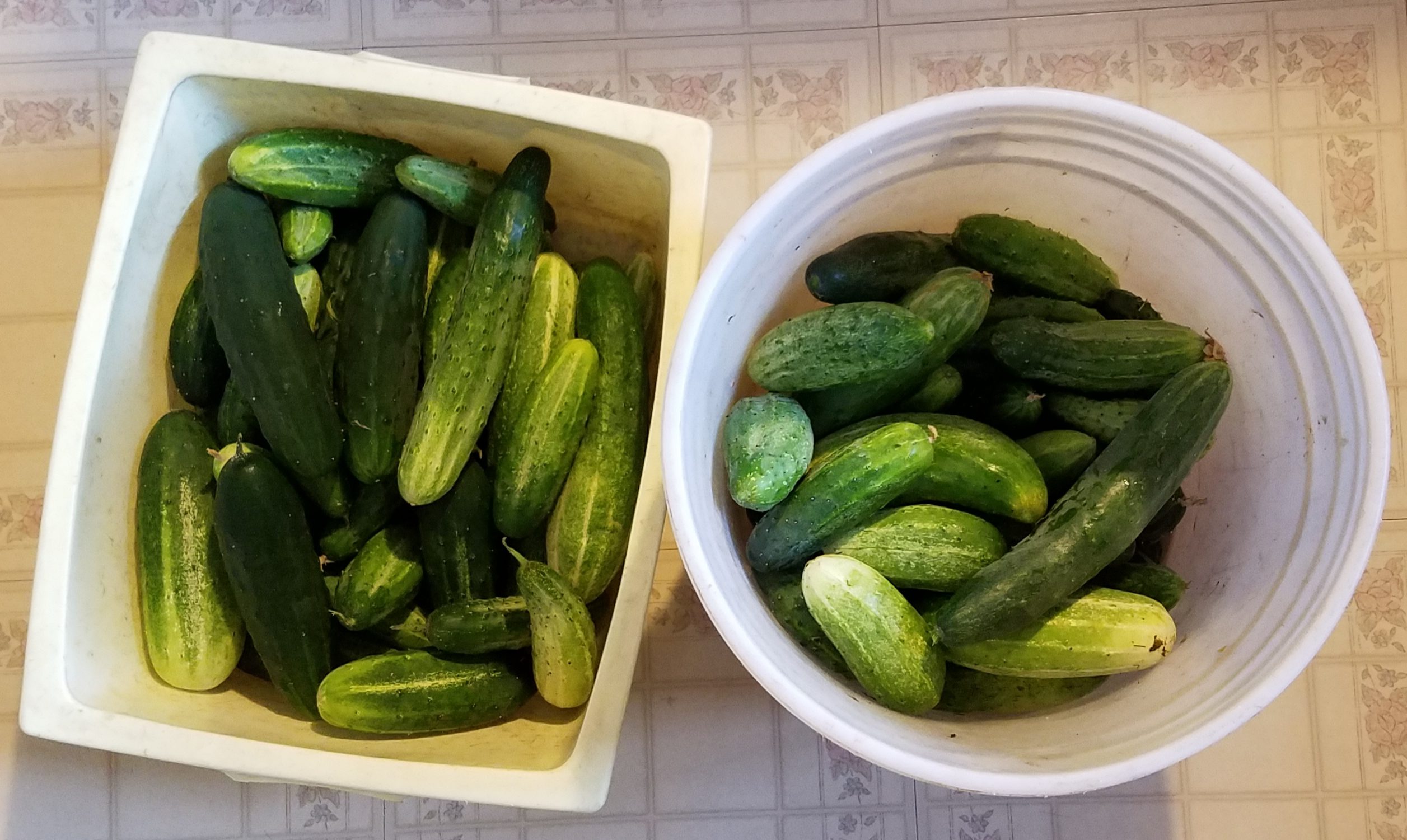 In the kitchen I emptied the crock of fermented dill pickles and started another batch. I washed and sorted cucumbers on the counter: first the dills, then sweet pickles, then some for eating, then a pile of too plump ones for juicing. There are so many cucumbers I could be selective. Soon I’ll run out of things to do with them… not yet.