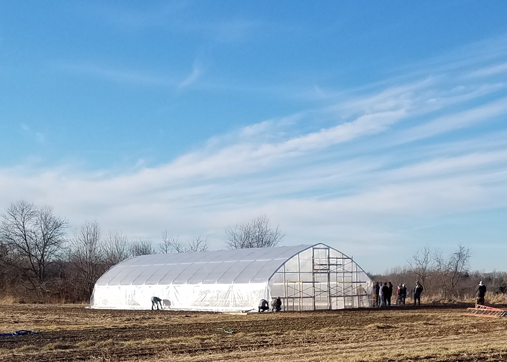 The eagle lofted in the wind as if it were summer. We would rather the wind died down until we finished. The project was well-organized and it took an hour and a half for 20 of us to get the plastic stretched over the aluminum frame.