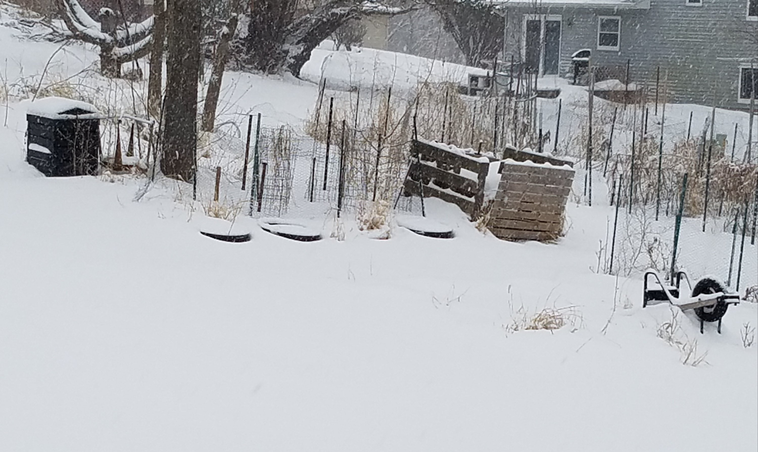 Between two and three inches fell with more coming. I had planned to secure provisions in the county seat, but now I’m not sure. Even if I go, errands can wait until snow stops and roads are cleared in a few hours.