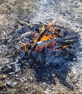 Instead, under a clear sky and cool spring temperatures, I re-stacked the burn pile, lit it, cleaned up around the second garden plot and planted radishes in a container.