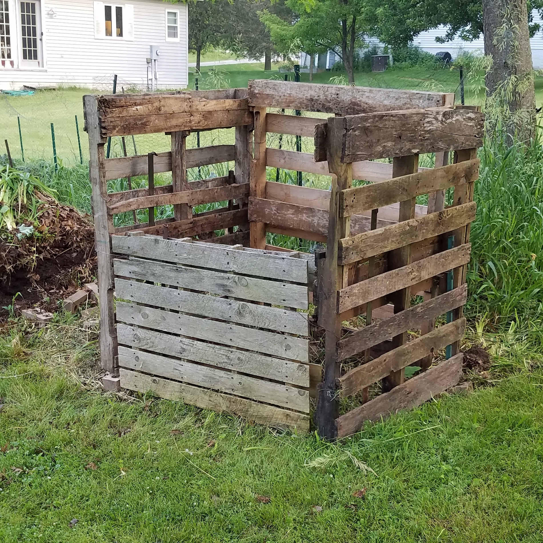 During the last few years I secured some pallets and made one. It works great for all the greenery I harvest and weed from the yard and garden. It was time to use the compost in the bin so I re-built the device on a different spot, replacing the pallets that were being composted from exposure to the ground. While portable, it’s a permanent fixture in the garden.