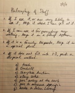 The impetus has been recent awareness of mortality, highlighted by the death of Mother. She did things right and disposed of much of her stuff during the years before she moved in with my sister. Many of us would emulate the best qualities of our parents. We can’t take stuff with us when we die, and what reasonable person wants to leave the trouble of sorting it to others?