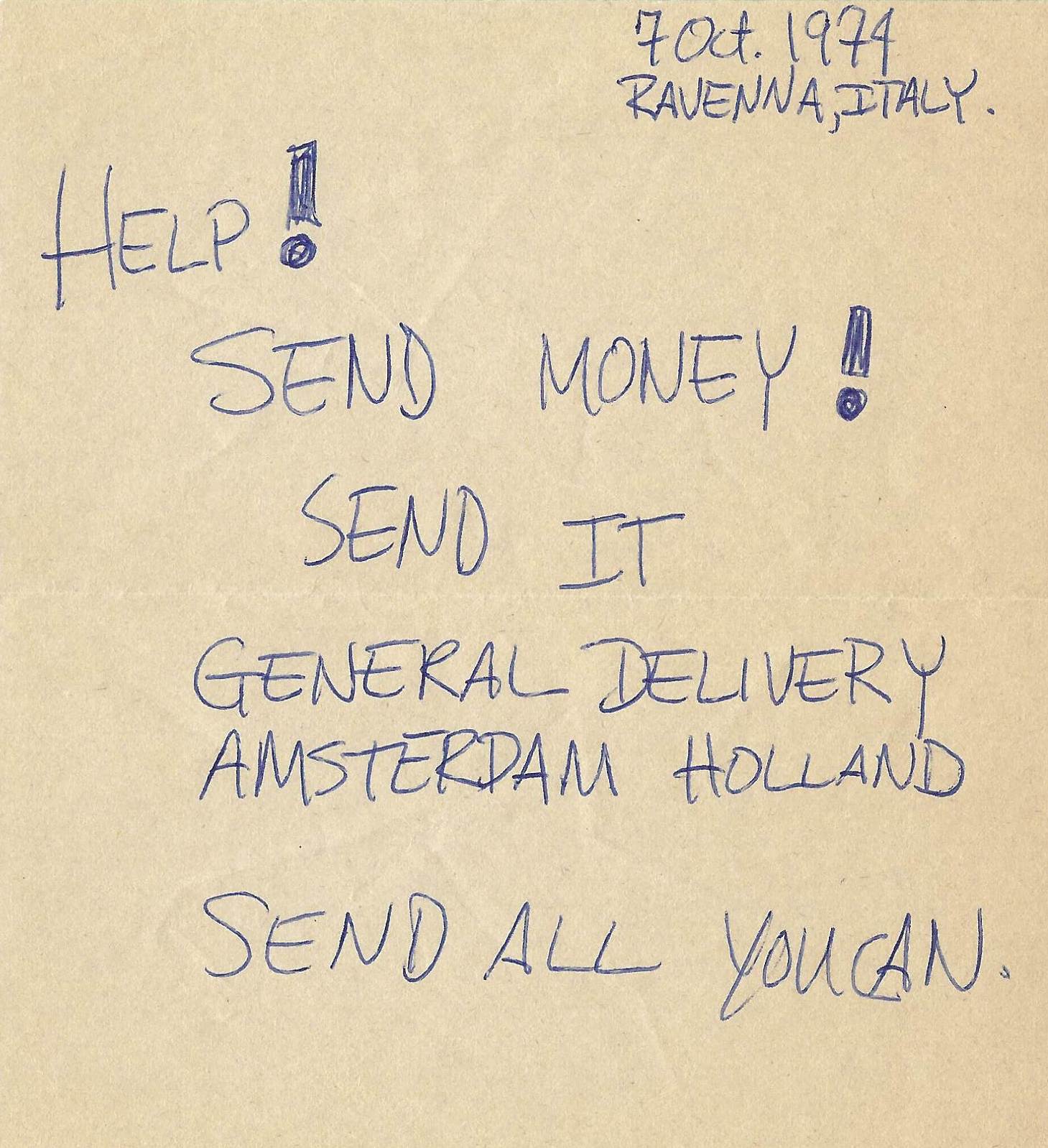 I was concerned about funding the rest of my European trip while in Ravenna and sent the pictured note to Mother. She came through with an American Express travelers check which was waiting for me when I arrived in Amsterdam. It turned out I didn’t need the cash. I don’t recall whether I gave it back to Mom when I returned to Iowa. She kept the note.