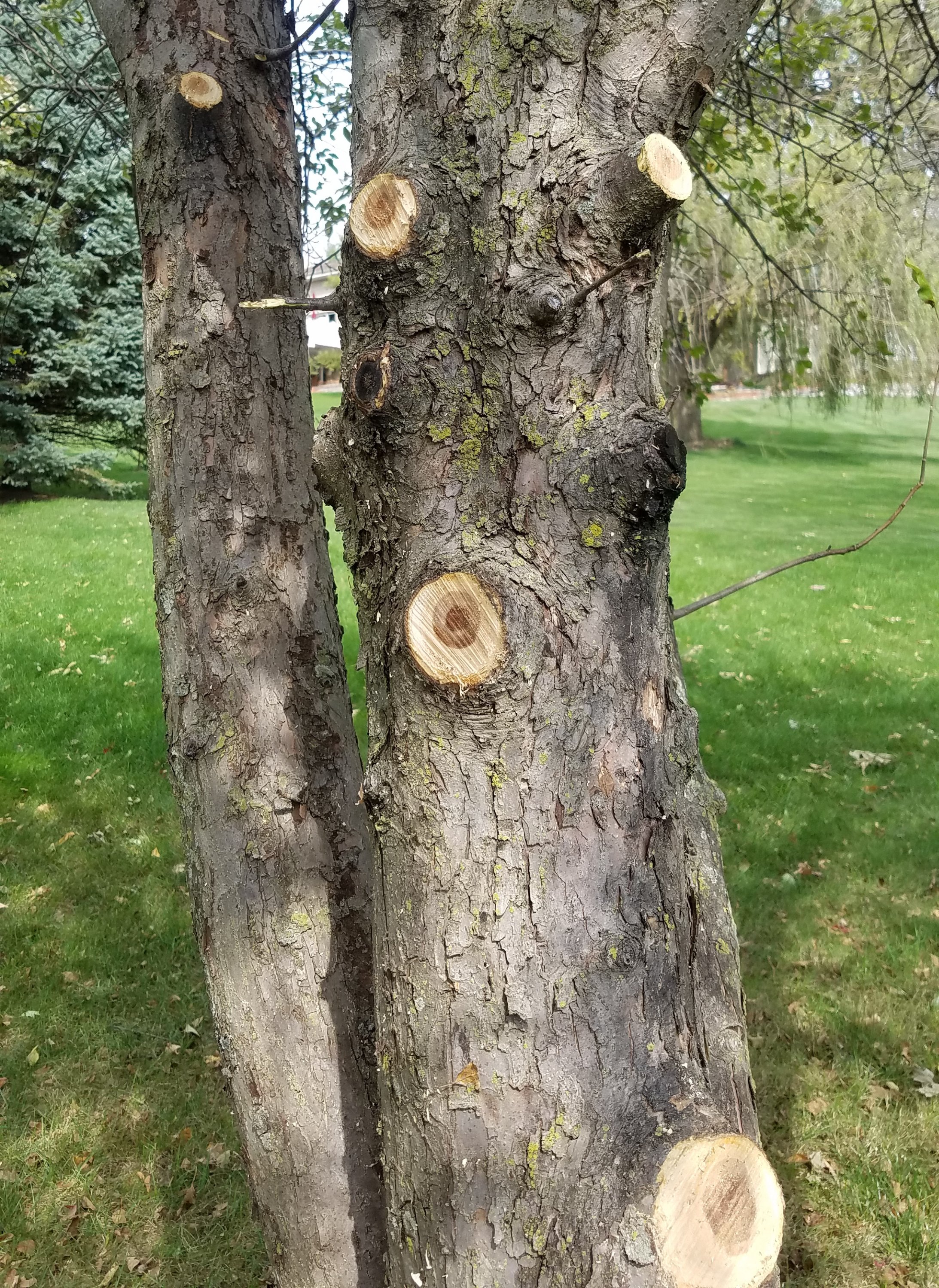 It is not ideal to chainsaw dead branches from living trees in autumn yet that’s what I did during my morning work shift. The wounds provide an entry point for insects which may eventually kill the tree. Some of these apple trees are eventual goners, so there was little to lose.