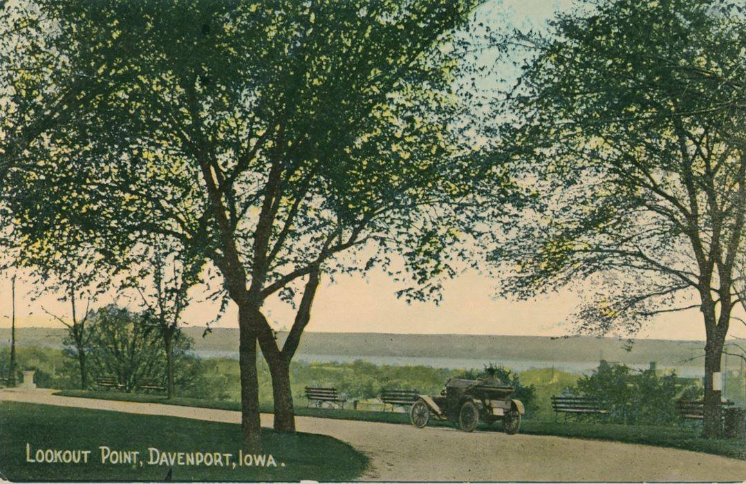 I played at Lookout Park, which was within walking distance of home, before I attended school. The main features are the view of the Mississippi River depicted in this postcard, a long, steep hill in front of the benches, and a stairway from the bottom to the top.