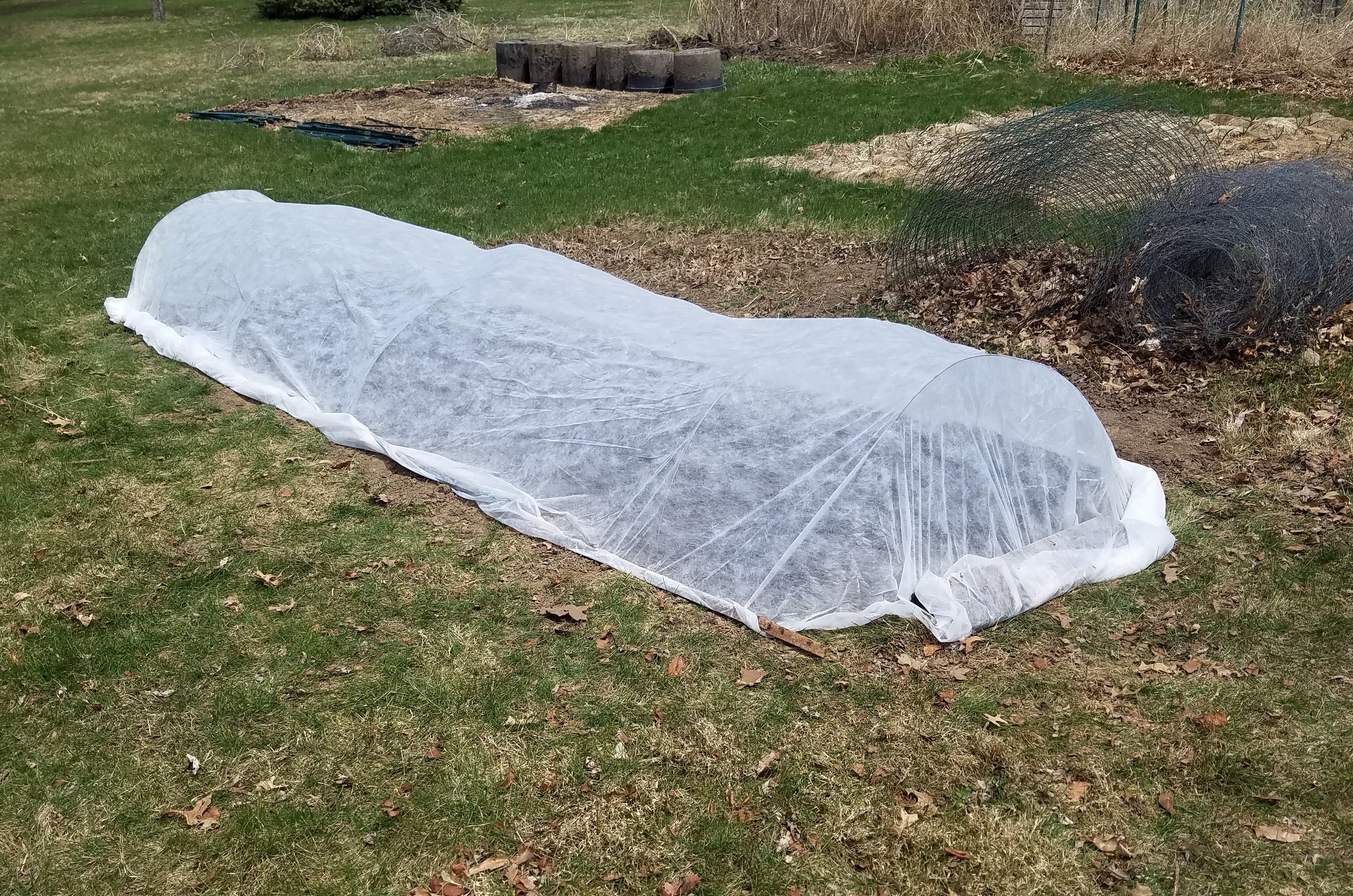 High winds blew the row cover off the frame multiple times on Monday. I went outdoors and fixed it. I ended up using landscaping stakes to secure it in 40+ miles per hour wind. By sundown, the wind slowed. It was too late to get back to the garden.