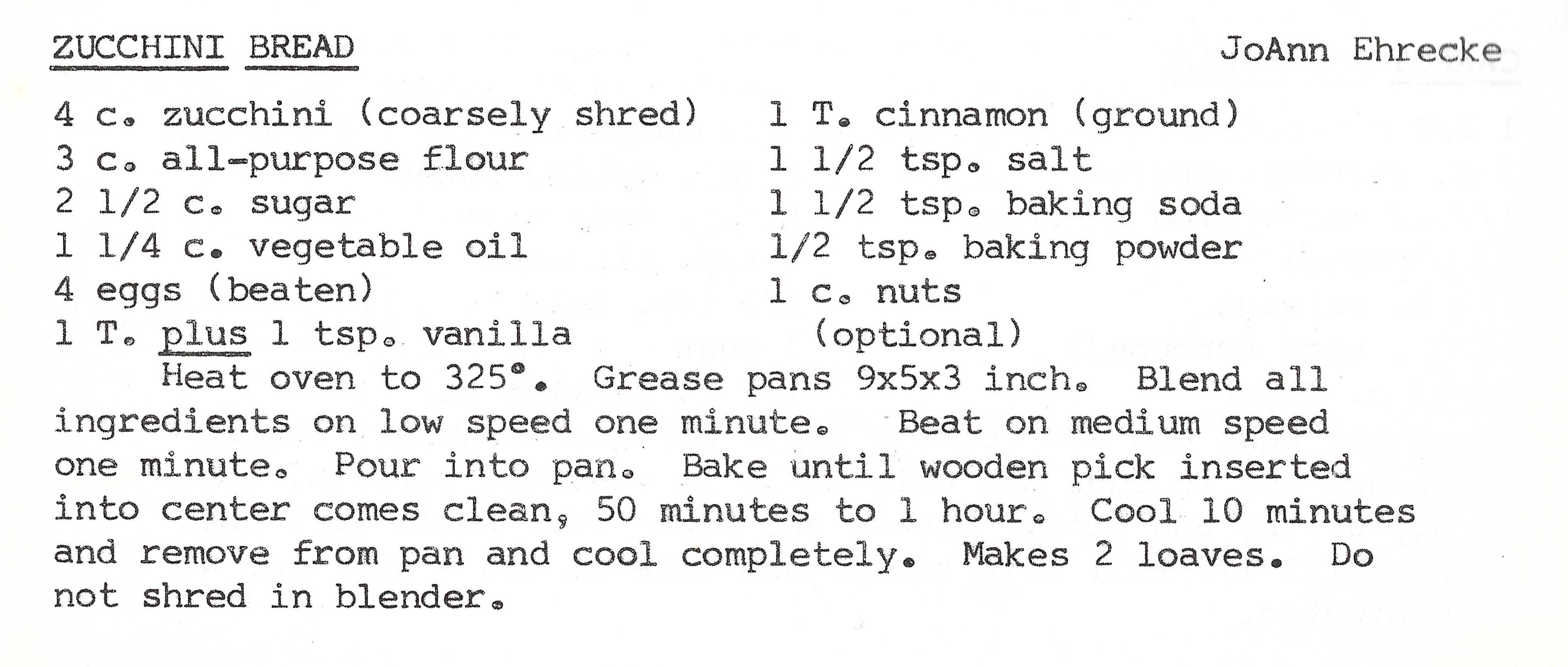 JoAnn Ehrecke submitted a recipe for zucchini bread to the Family Favorites cookbook published by Holy Family Parish, Davenport Iowa in 1977. It used four cups of shredded zucchini, which is a lot. I had been to the Ehrecke home at least once while I was in school, so the recipe came with a positive vibe. Not only is it a product of the 1970s, it is set in that time. I followed the recipe with some adjustments to accommodate vegan eaters and modern times. The result was a dense, sweet loaf, more like cake than bread. We’ll use it, but won’t return to this experimental recipe.