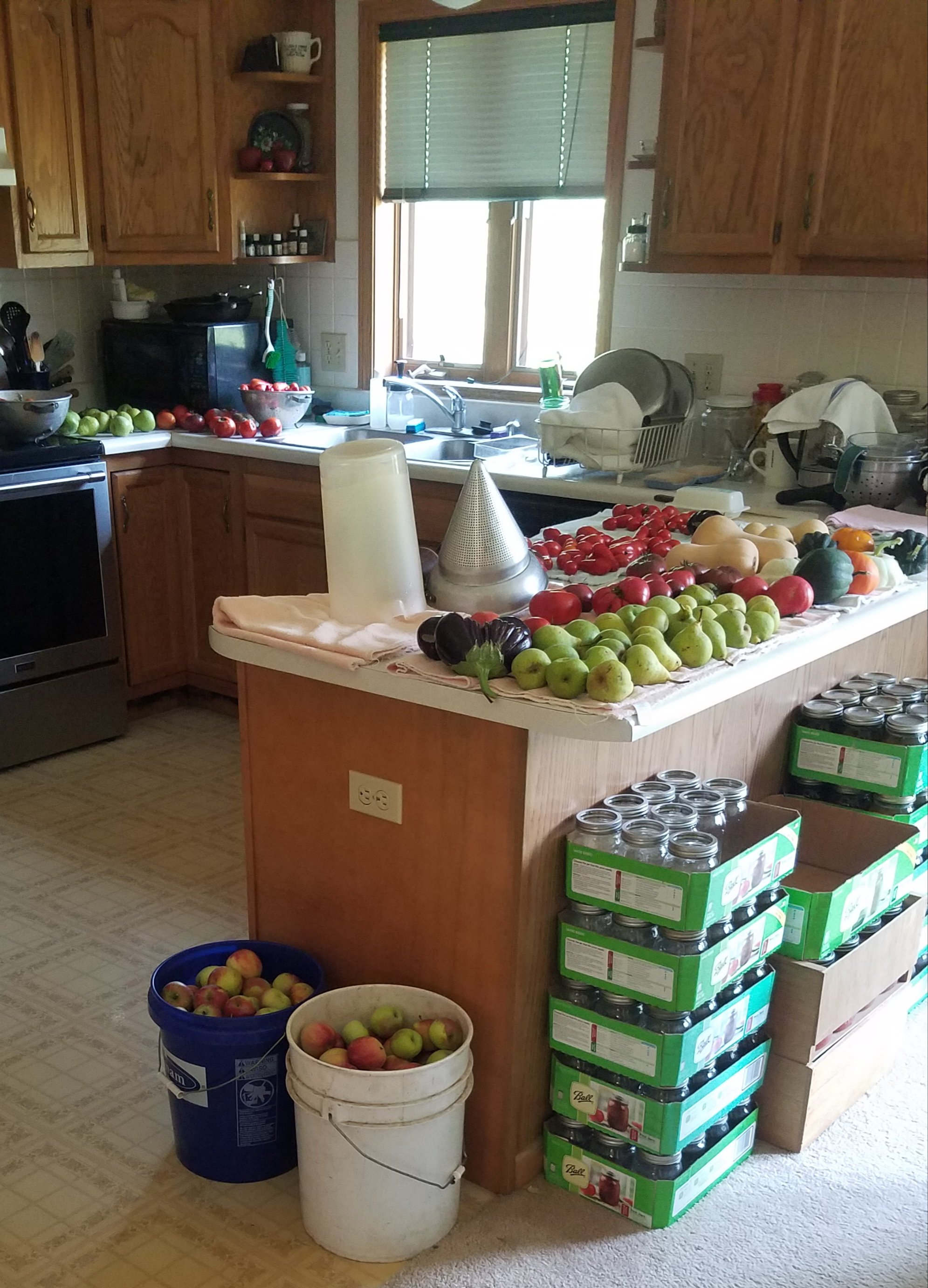 It is hard to keep up with the garden’s abundance. On the counter are tomatoes, pears, apples, squash, and eggplant waiting to be processed or cooked. In August, this could be a full time job. I truly want to can tomatoes for winter. Luckily, they have a reasonable shelf life and I can process them before spoilage. Half of the challenge in the kitchen is knowing what to process, how, and in what quantity.