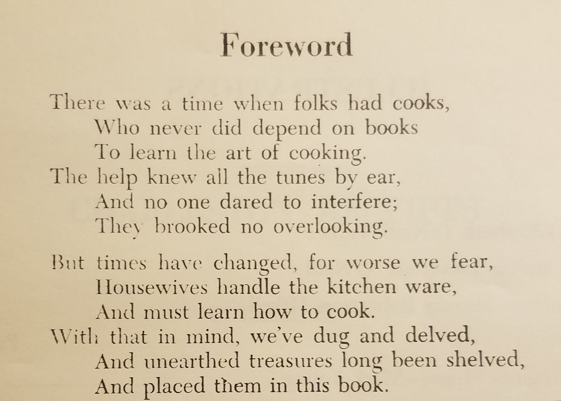 I don’t know about this forward to a 1950s cookbook, Charleston Receipts. The unspoken part is cooks in the first verse were mostly black women, and housewives in the second were white. It is not overtly stated, but I’m certain it was implied. This book trades on fond remembrance of antebellum food culture. The word plantation is used in the names of some of the receipts (not recipes, per the author).