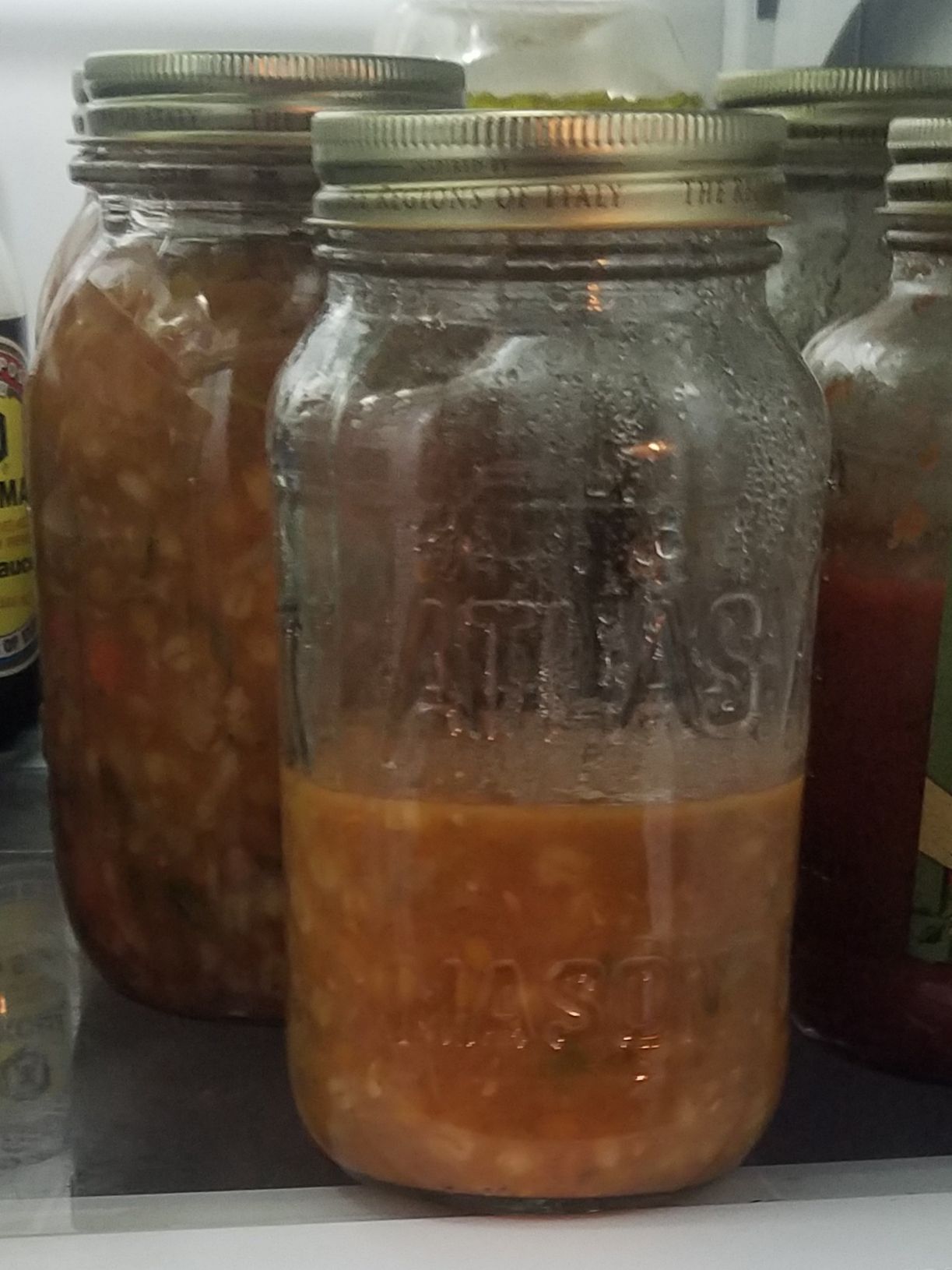 From the freezer I added two one-cup bags of shredded zucchini and two frozen disks of fresh parsley. By now, the lentils and barley were absorbing the liquid so I added tomato juice and one quart of water to cover. I used a total of three quarts of tomato juice and one quart of water.