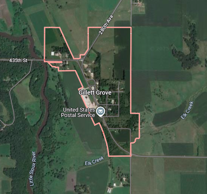 Its history is brief. “First settlers appeared in Gillett Grove in 1856 and the town, named after the Gillett brothers, was incorporated on May 13, 1874,” according to the website Travel Iowa. “The town was originally located west of the (Little Sioux) river and one and half miles North until 1899 when it was moved to the east side of the river along with the arrival of the railroad.” I don’t see railroad tracks on Google Maps.