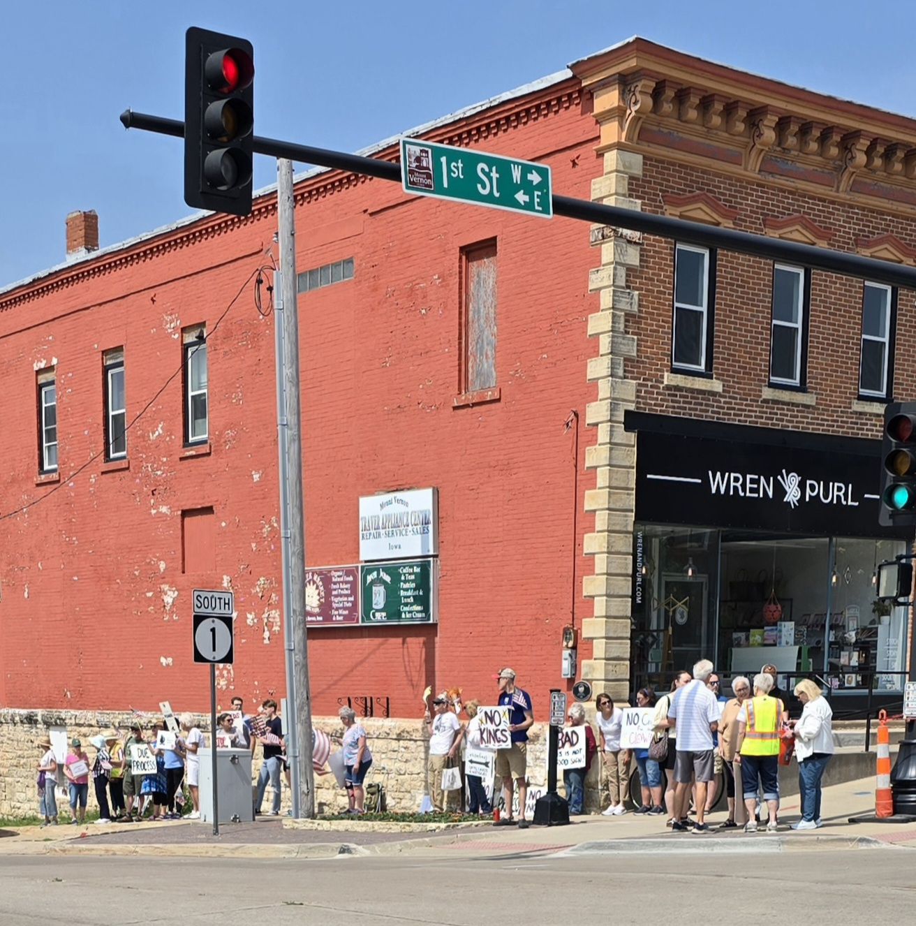 I counted more than 350 people lining Highway One near the intersection of First Street in Mount Vernon in support of the No Kings rallies taking place across the United States and in some foreign countries. The event was straight forward. People brought home made signs, held American flags, and waved at people in vehicles passing through the intersection. There were a lot of horns honked, waving back, and even a crank with a Trump 2024 sticker in his rear window who repeatedly drove through our demonstration. It was all good.