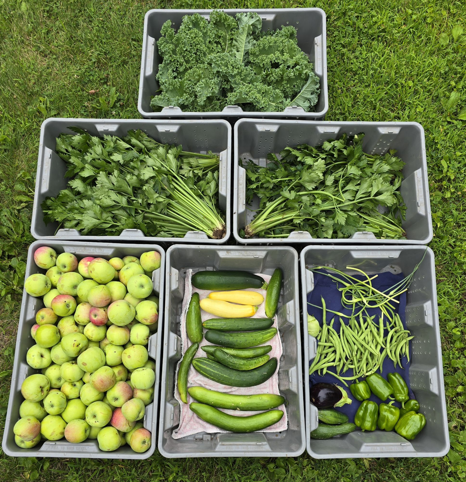 When the garden is going gangbusters, the challenge is to use up or preserve as much as possible, as soon as possible. Two of the crates in the photo above have celery in them. Celery gets processed into four different things: I keep “hearts” of celery for cooking fresh, ending up with ten of them this year. The various outer stalks are separated from the leaves. The stalks with some size to them are chopped into small bits and frozen to add to soup. All the very small pieces of stalk and stem are roughly cut, bagged and frozen for use in making vegetable broth. Finally, the leaves are rough chopped, bagged and frozen to add to soup. I use the whole plant. All of this takes a bit of work, yet the flavor makes it worth the effort.