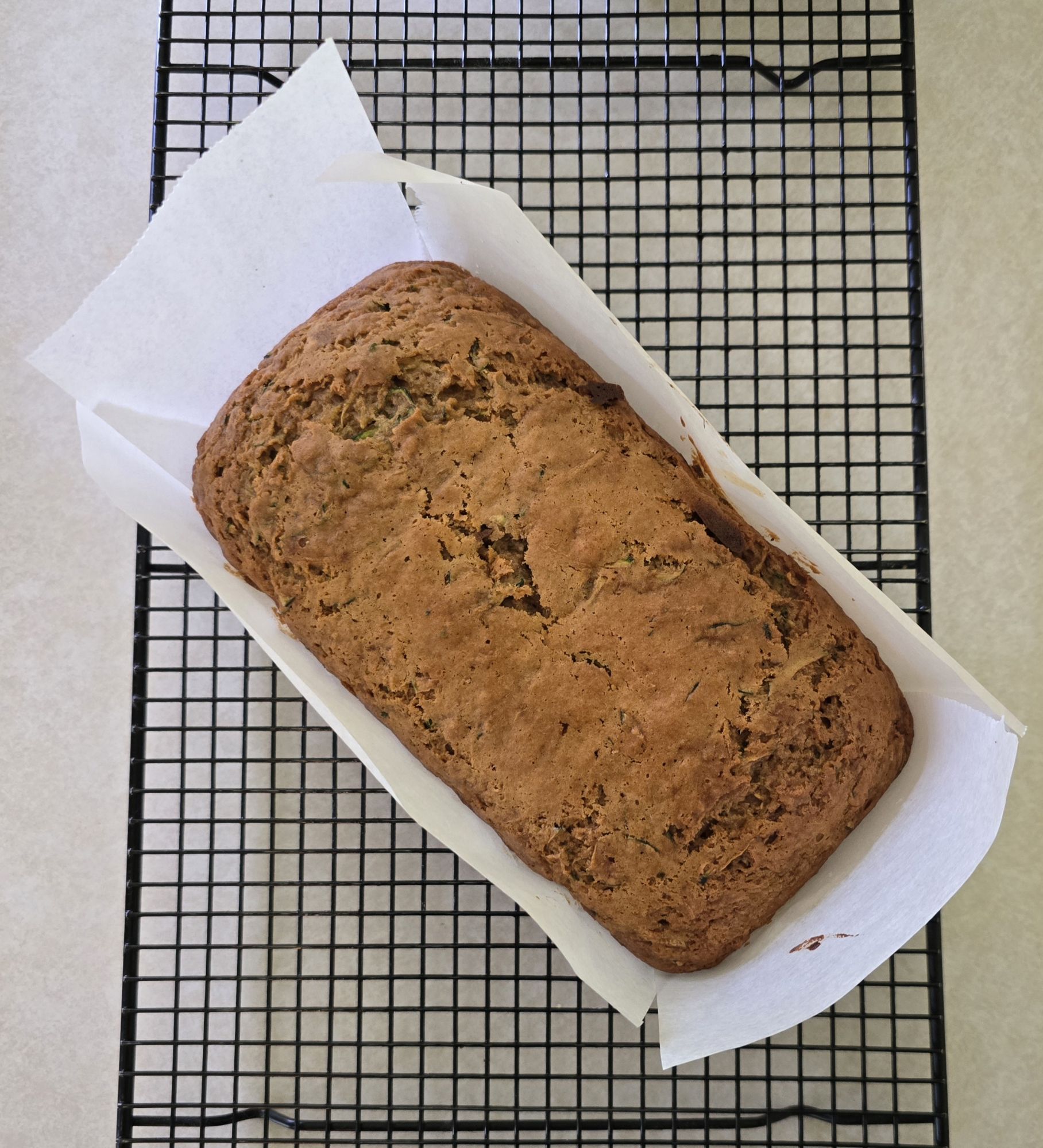 The garden is about finished with zucchini. I modified my zucchini bread recipe, substituting applesauce for the oil, and by wringing the water out of the zucchini with a towel. It is to set for 2-3 hours before cutting so I haven’t tasted it. It appears to have had the desired effect which was to decrease the moisture in the loaf and reduce cooking time. It should be good.
