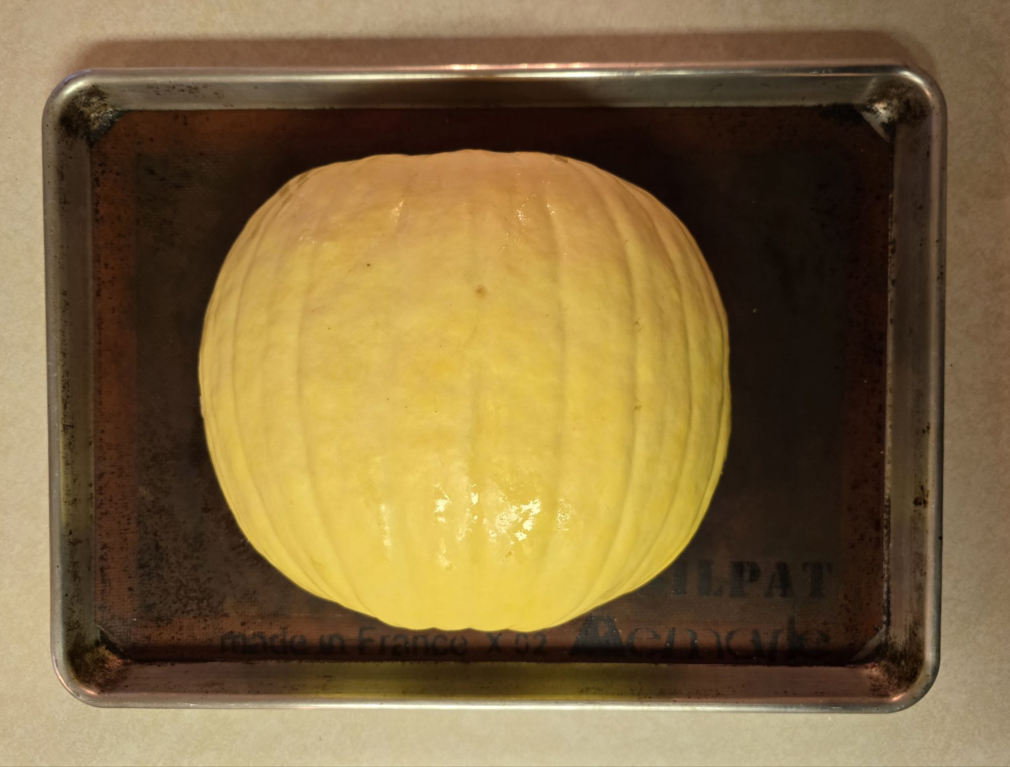 Both halves went into a 400 degree oven and baked about 90 minutes until tender. The timing varies depending upon size of pumpkin and quality of the oven.