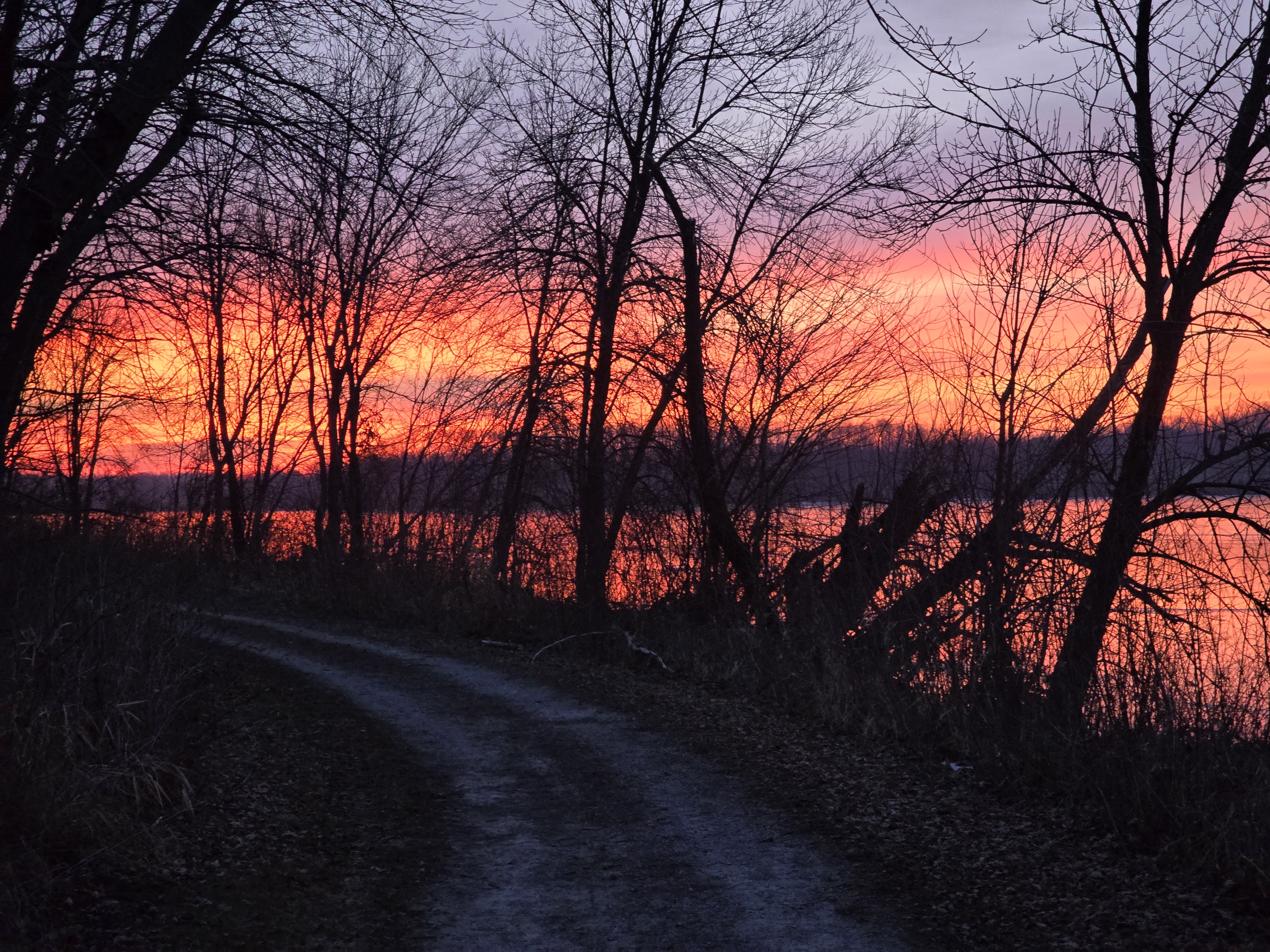 I spent a good part of yesterday on the road to Des Moines and back. There was fog around Grinnell, yet visibility was good. By the time I returned, I was beat — a person only has energy to describe the Iowa landscape as a post so many times. So here are two photos from the state park trail earlier this week. The sun puts on a better show than I ever could.