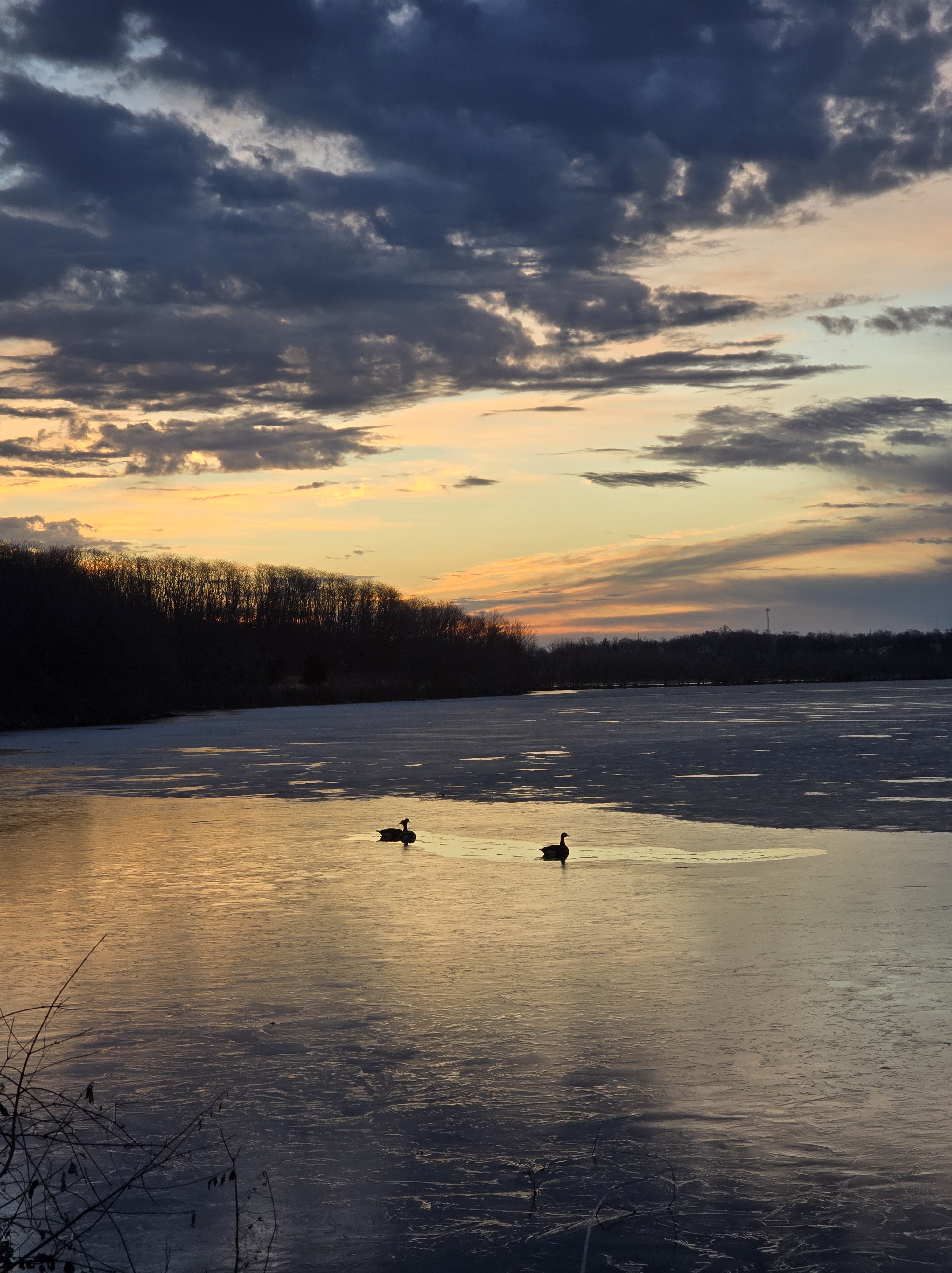 It snowed enough Friday morning to shovel the driveway. That 40 minutes of exercise substituted for trail walking yet I got this photo the day before. Ambient temperatures the next couple of days are forecast to be in the teens, so geese swimming in open water may have to find something else to do. I have plenty to do indoors.