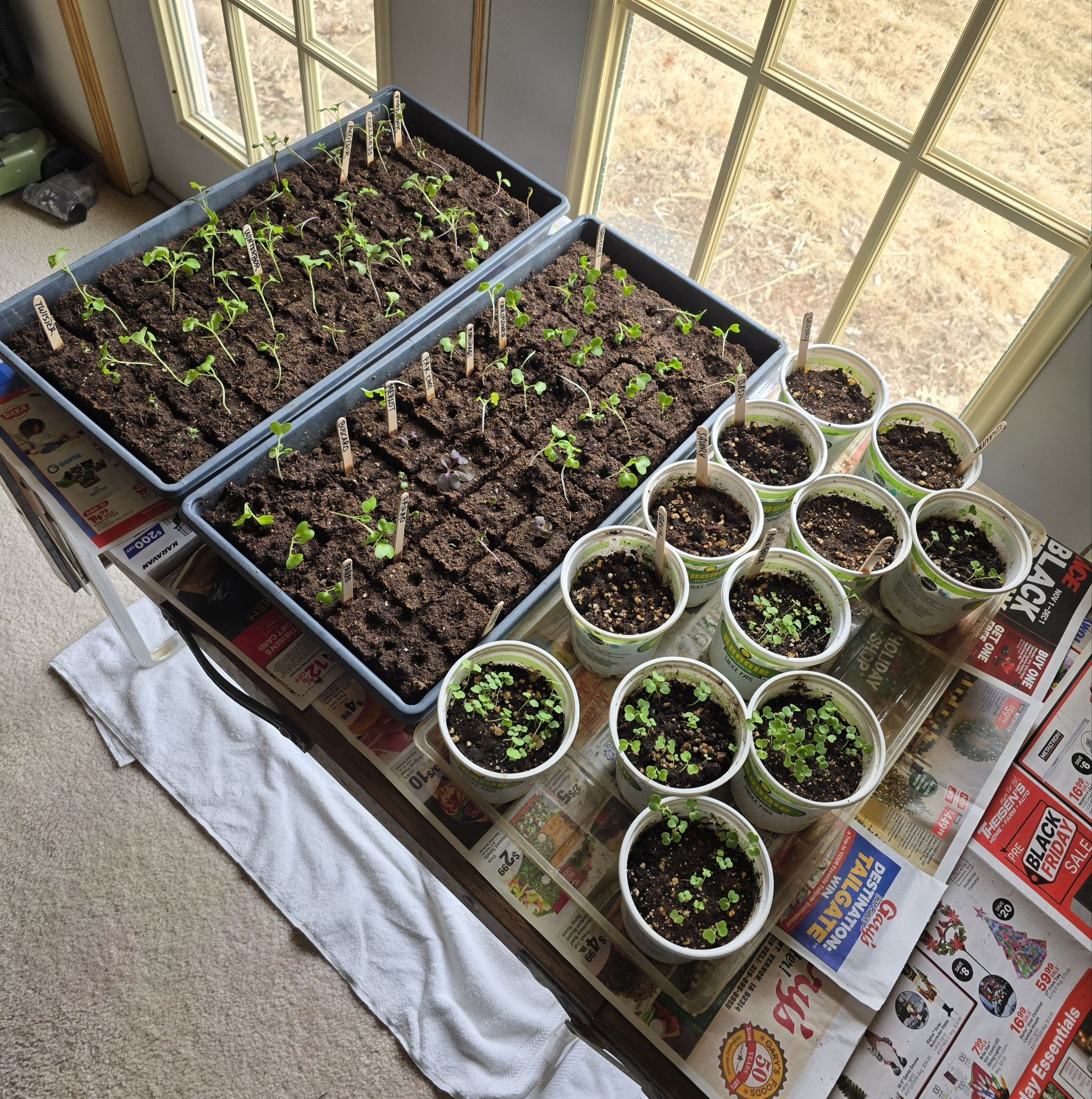 After five planting sessions, there are seven trays of seedlings between the heat pad, grow light and table in the dining area. This year, indoor planting is proceeding well.