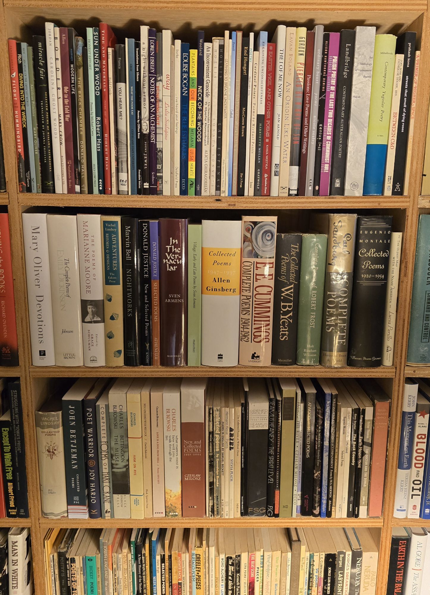 Roughly a fifth of them were purchased deliberately when I searched for a specific book of poetry. The rest are from remainder piles, used book stores, Goodwill, the Salvation Army, yard sales, and the community library used book sale. There was intent behind each selection based on what was available. The shelves are not as random as one may think.