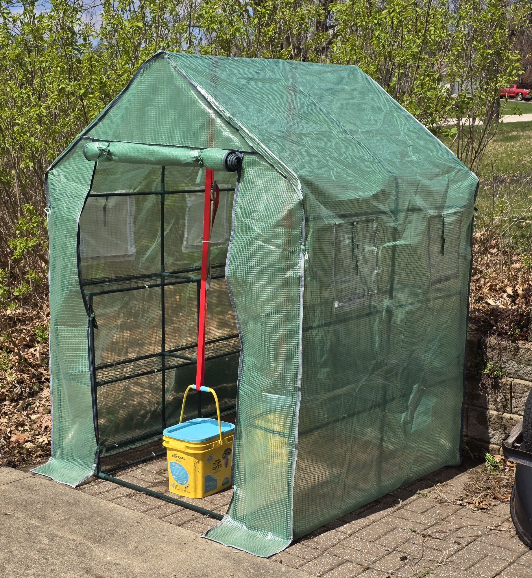 It took me about 90 minutes to reassemble the greenhouse. I let it sit overnight, then began moving plants from indoors. The forecast is for no freezing overnight temperatures the rest of the week, so it was as good a time to get it up. The forecast Monday and Tuesday is highs in the 80s. Yikes! It’s April 13!