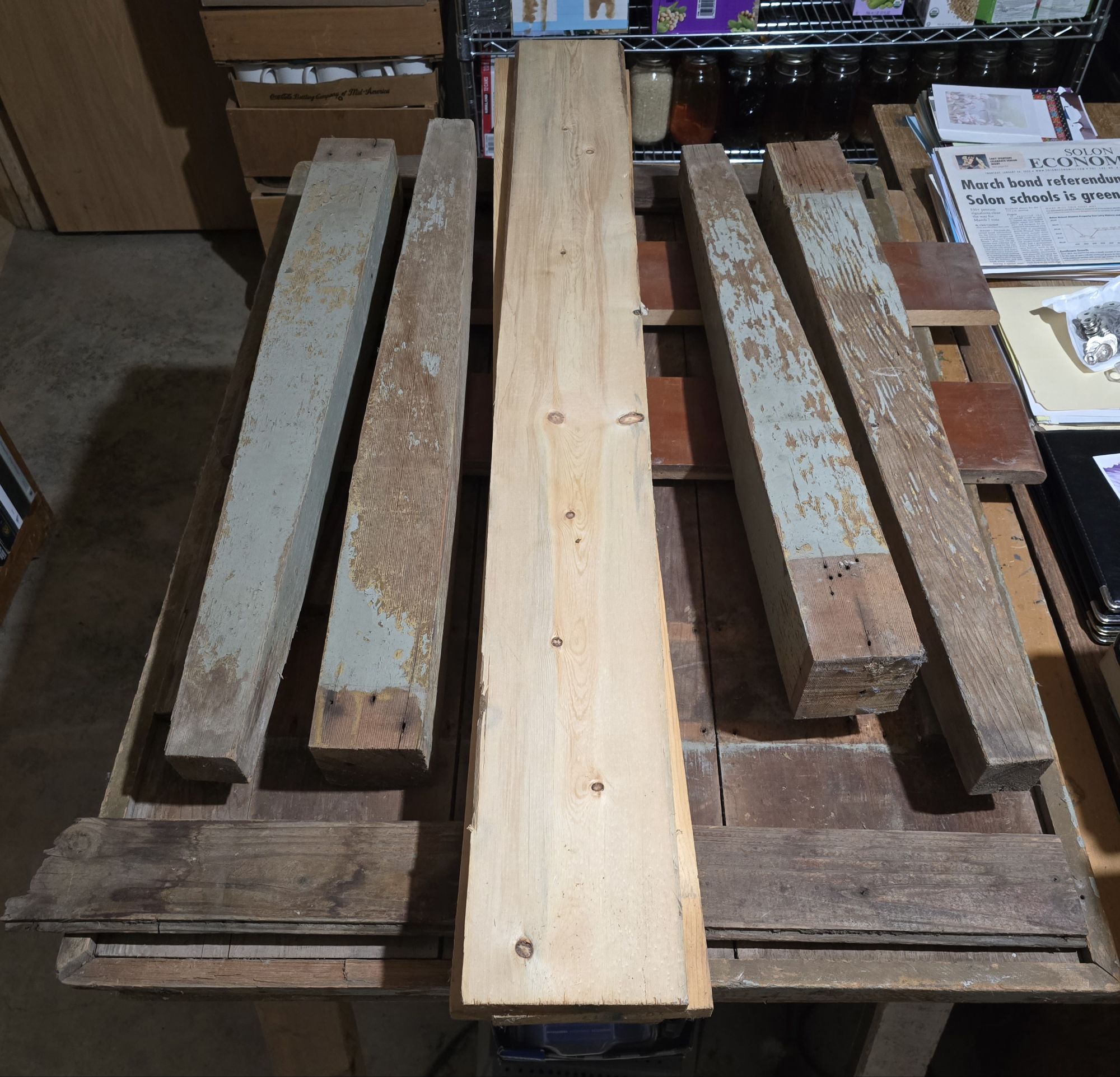 Table made from a top, four legs and salvaged lumber.