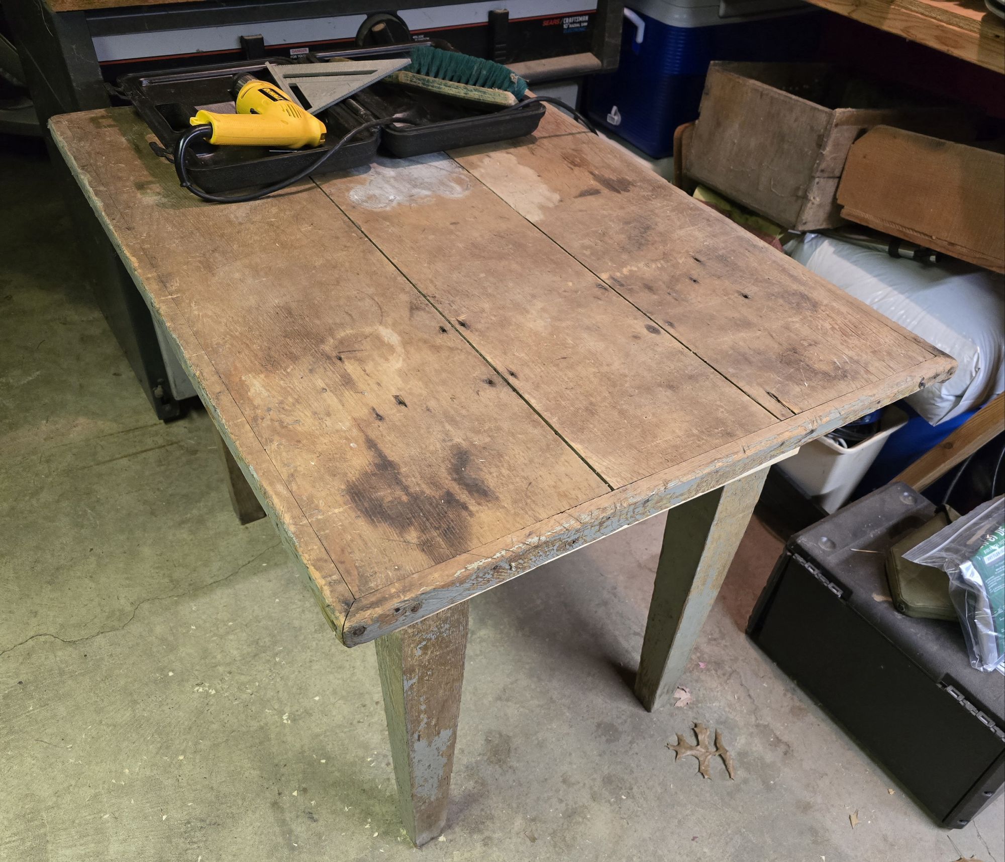 There was a time when I attended estate and farm auctions and bought things on the cheap for later projects. The years since then can be measured in decades. At a point in my life when I have to either do something with stuff, or otherwise dispose of it, I got out the top and legs of a table I bought for a buck at auction. It was time to make something. Since I rearranged the garage, I have space for a work table that is shorter than the custom-height workbench I made when we lived in Indiana.