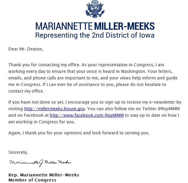 Below are the Iowa senators’ unedited responses to my query. Grassley’s is first because he is our senior senator. Ernst replied first. I’m glad to hear from our elected representatives.