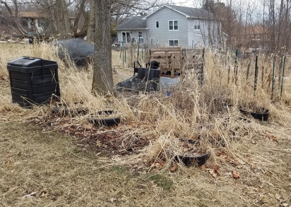 Yesterday the original plot looked a wreck with desiccated weeds and a hodge-podge of sunken containers, fencing, two composters, a wheel barrow, an old wash tub, six-inch pieces of drainage tile resting on a couple of pallets, and a locust tree. The locust tree was intended for transplant but it got away from me.