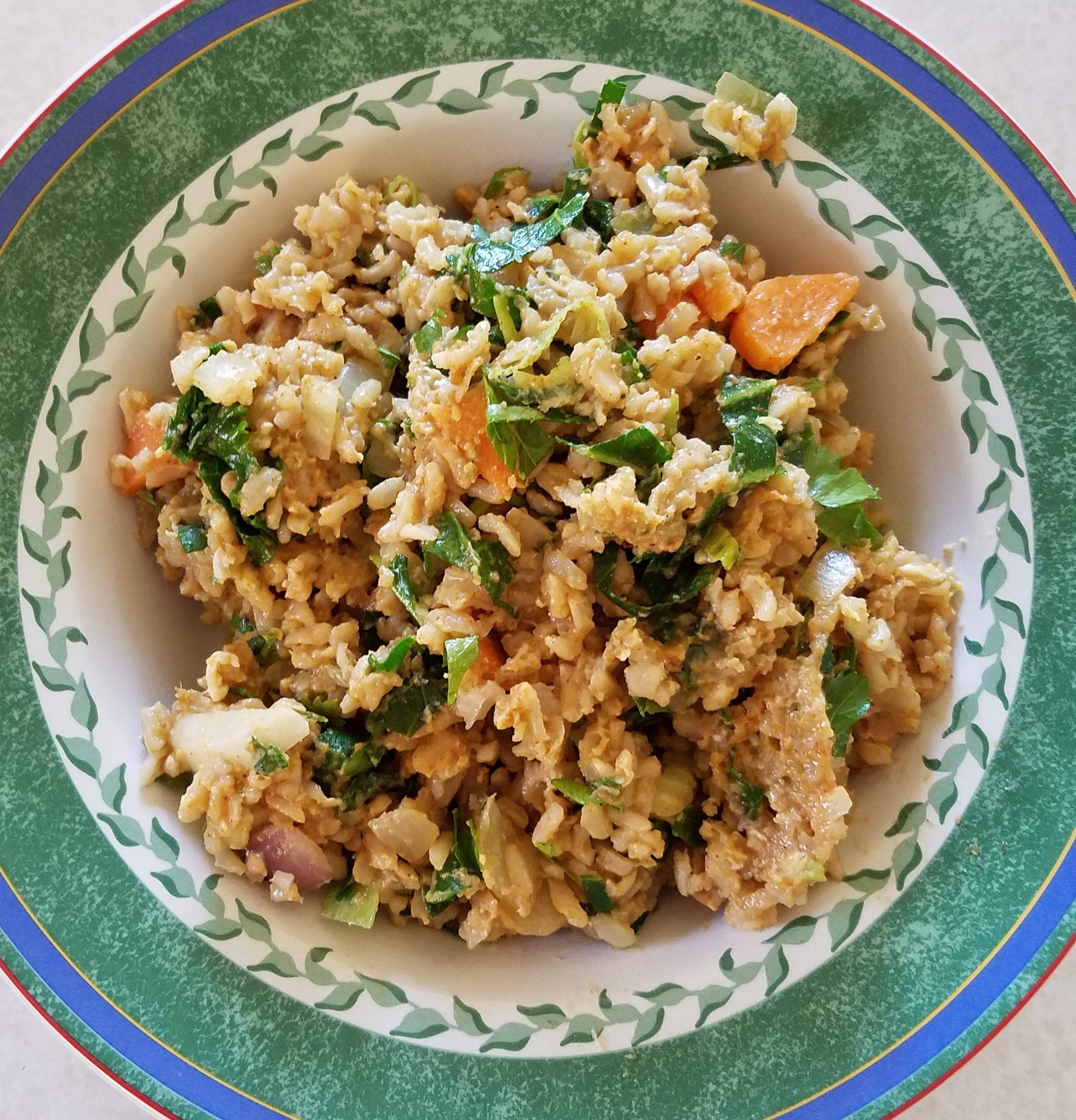 The rest is pretty easy. Place about four tablespoons vegetable oil in the wok and heat to temperature. Add vegetables one dish at a time in cook’s order (those needing most cooking first) reserving the parsley for finishing. Sauté and stir constantly until the vegetables begin to soften and add the eggs. Street vendors crack eggs directly into the wok, but I beat lightly in a dish and added them all at once. Stir constantly until the eggs begin to cook. Add the cumin and paprika at this point and incorporate. Add the rice and stir until the eggs are cooked and everything is incorporated and heated evenly. Add parsley and serve. Made four generous portions.