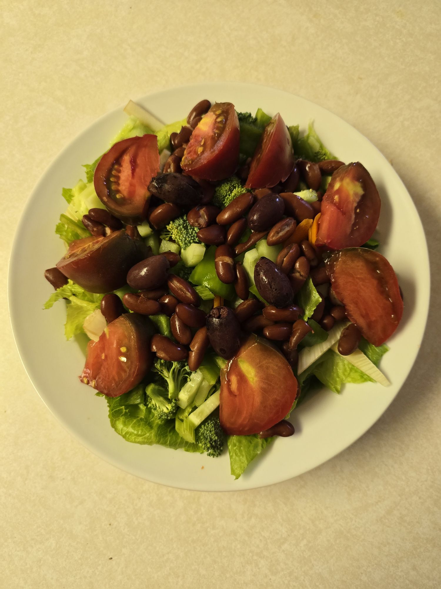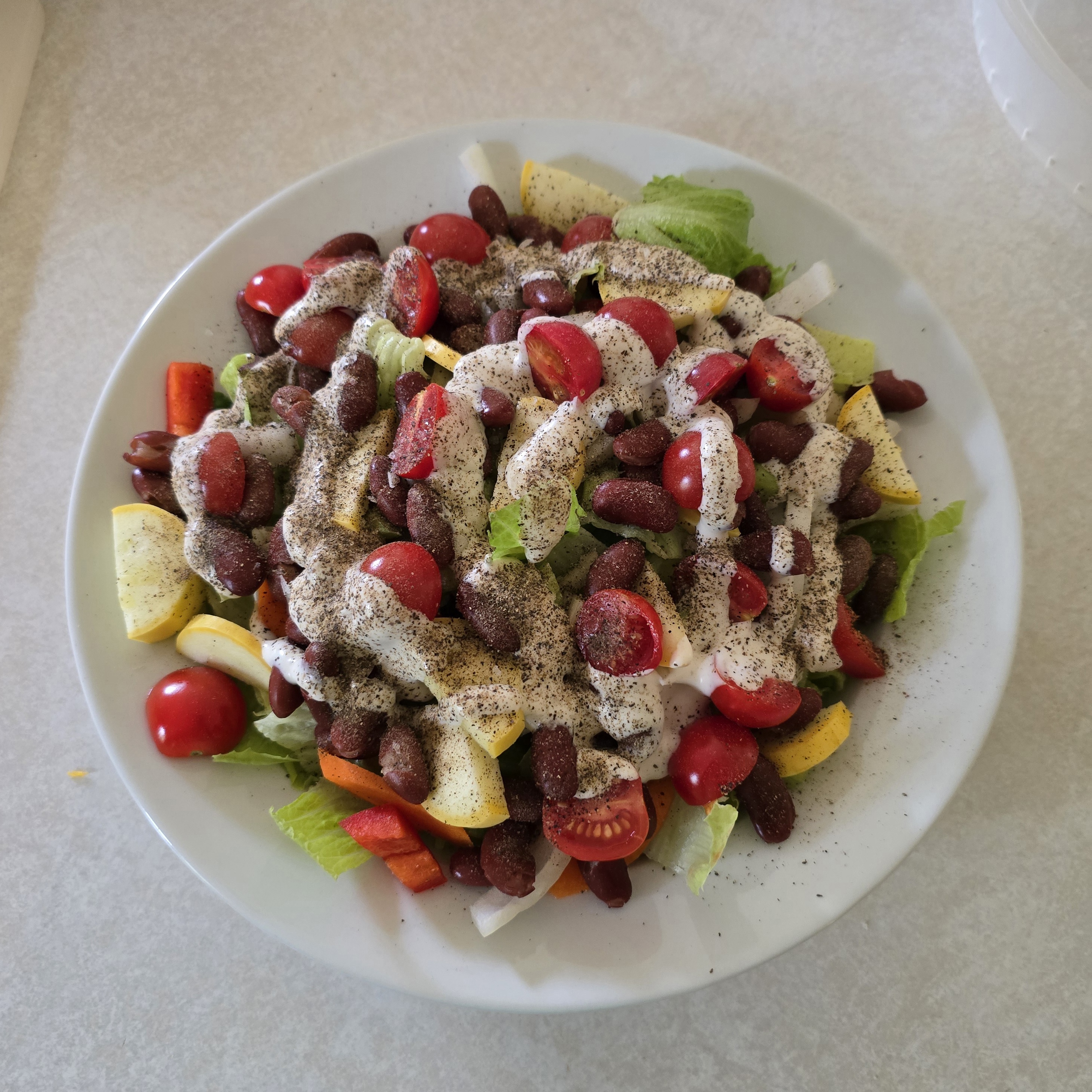 I made it to the kitchen at about noon and endeavored to get busy. I started with doing the dishes. More accurately, I started with the laundry. On the last Sunday of each month I launder my bed sheets and catch up on other laundry that accumulated. This took a bit of time out of kitchen work as I did five loads. I managed to make what I call “minced salad.” That is summer vegetables suitable for eating raw diced into one eighth inch cubes and mixed together with extra virgin olive oil and apple cider vinegar. I season with salt yet the seasoning possibilities are endless. It came out well.