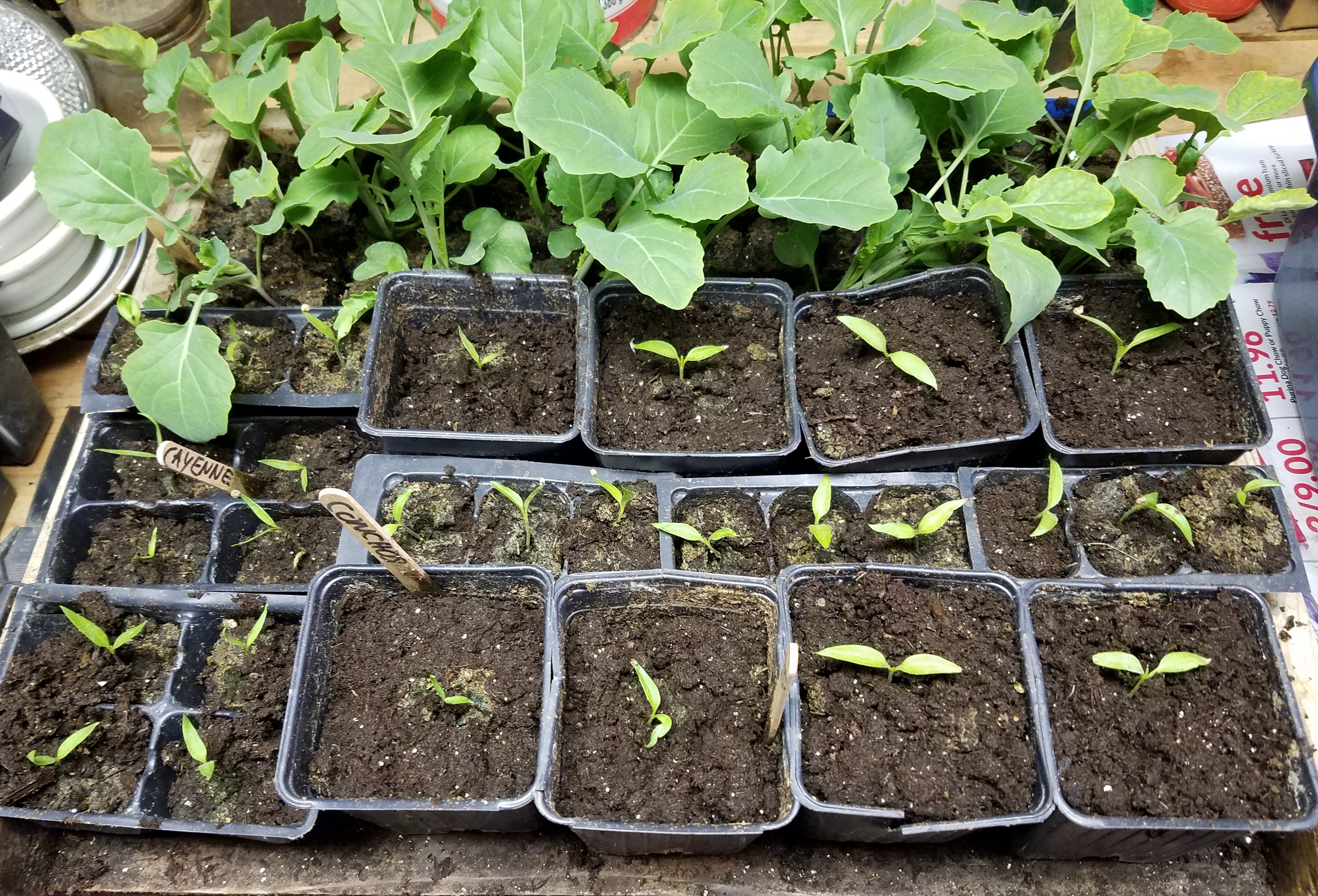 Broccoli and kale seedlings look good. After a third day of conditioning outside, they should be ready to go into the ground. I transplanted the hot pepper plants to larger containers. Three varieties in this batch: cayenne (8 each), conchos jalapeno (1 each) and early jalapeno (23 each).