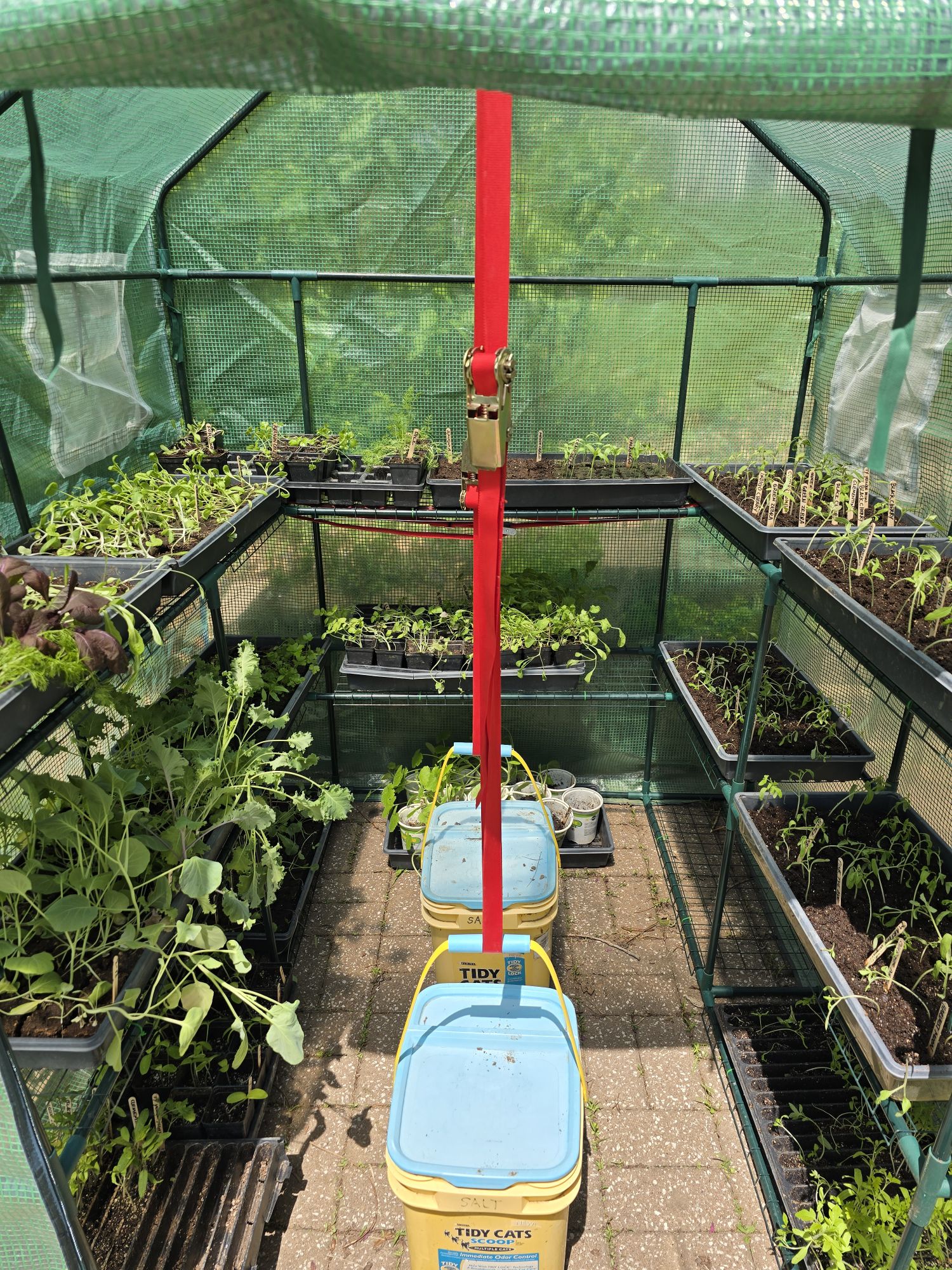 Over the weekend I assembled the greenhouse, moved trays of seedlings from inside the house, and transplanted tomato starts from channel trays into full-sized blocks. I feel I am way behind on the garden, yet things are moving.