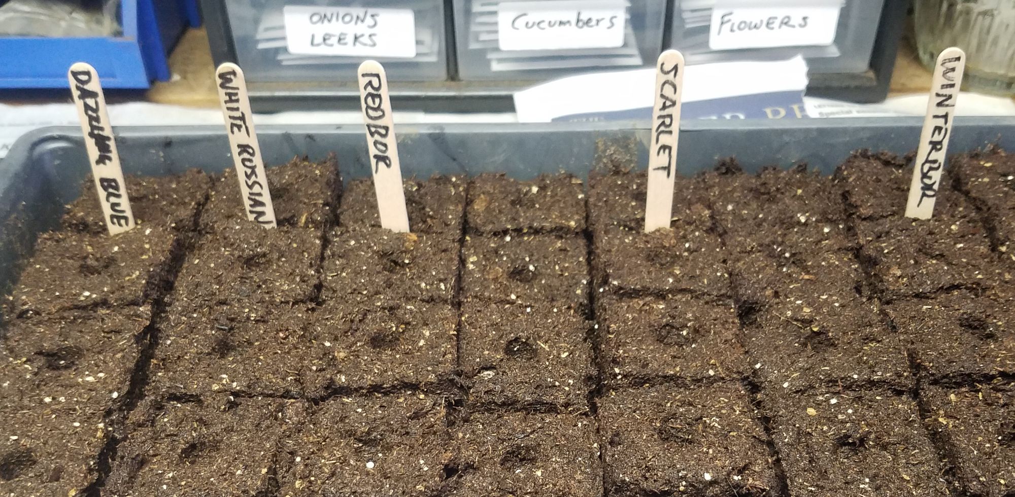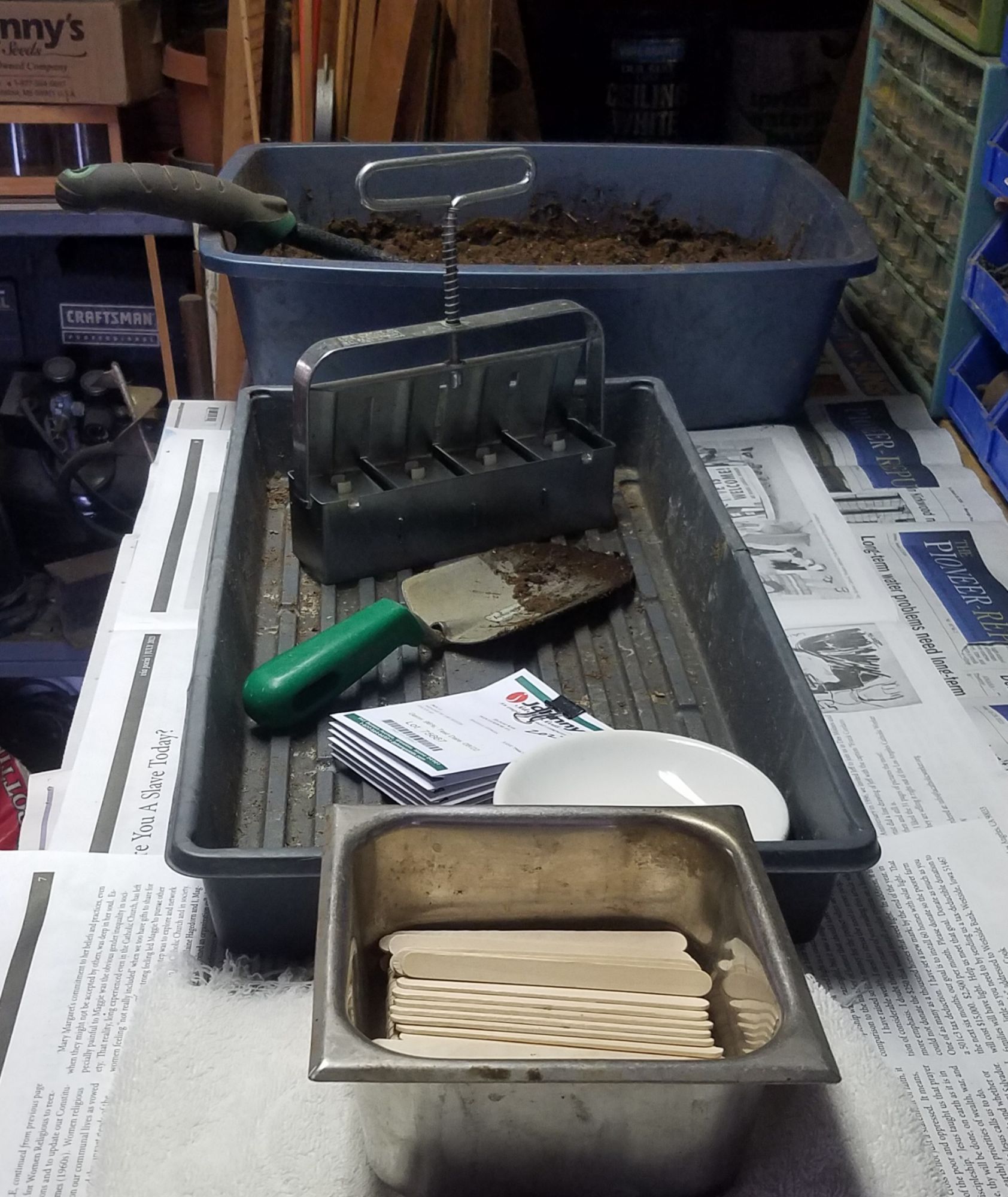 Tools to make the first tray of garden seedlings. Kale went in on Feb. 3.