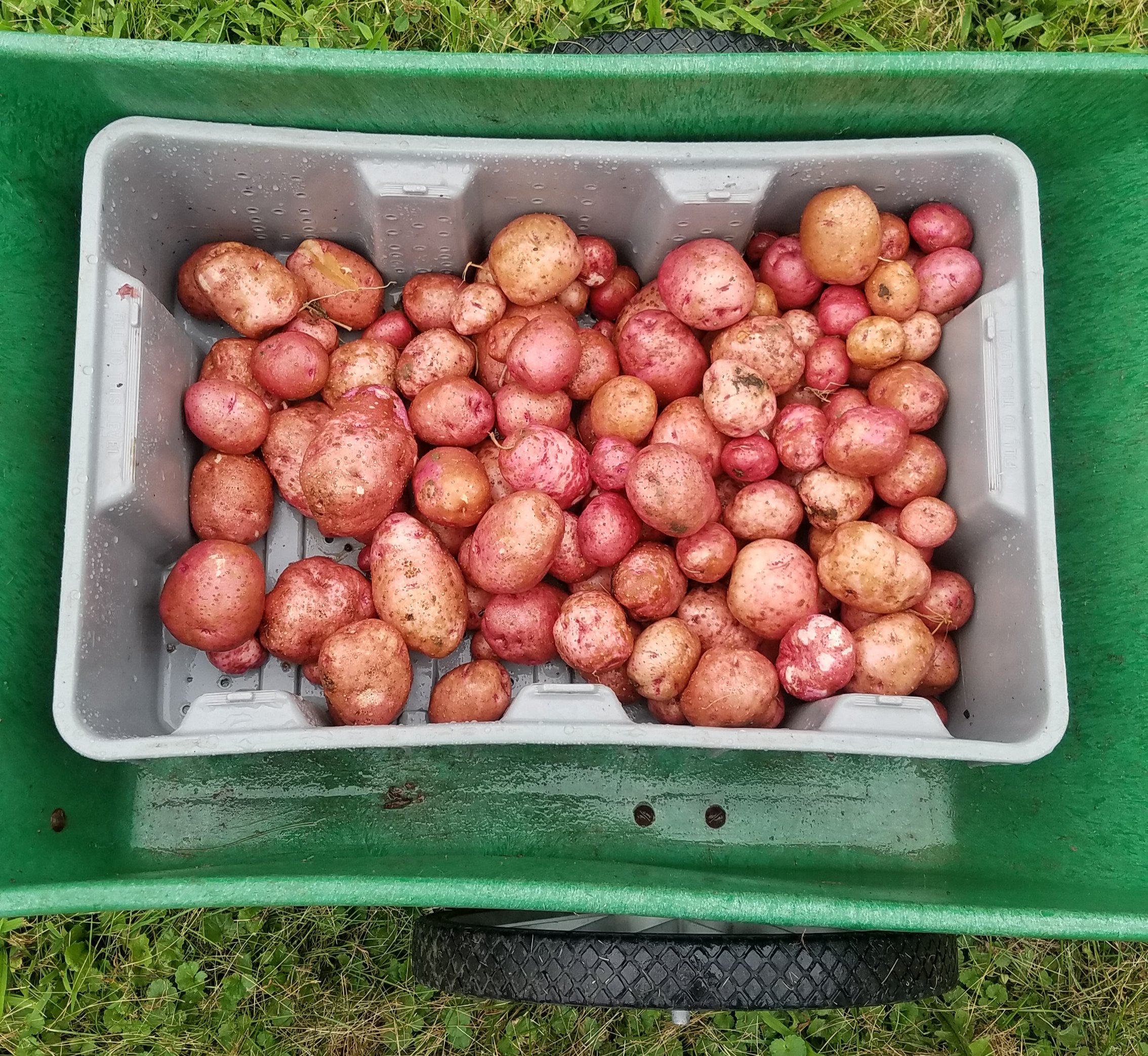 In August there is plenty of extra garden produce for donations to the local food pantry. Potatoes are popular and I could easily have donated this whole bin. They all would have been taken. Potatoes are elemental.