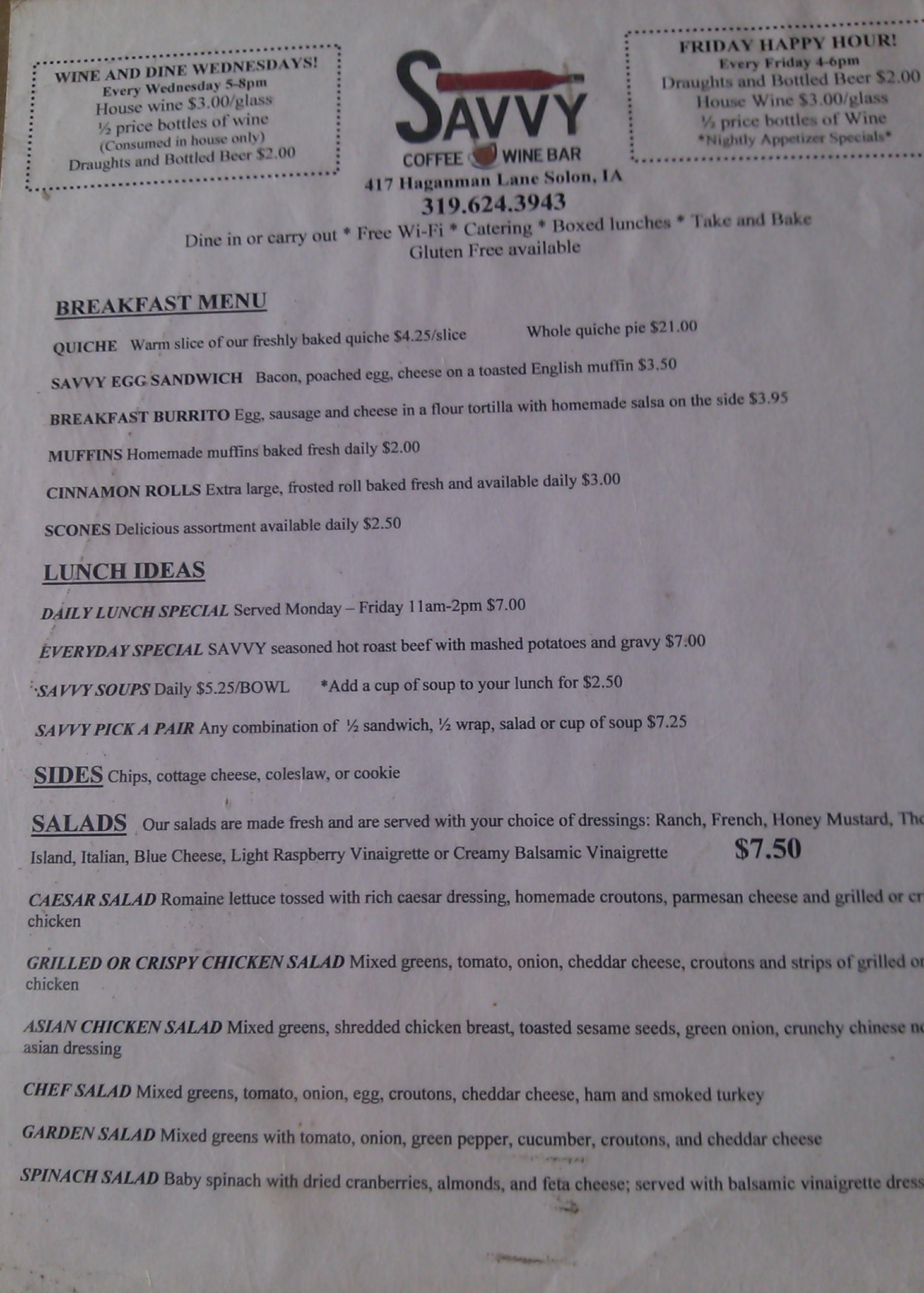 SOLON— Savvy Coffee and Wine Bar has been a place for friends to gather in Solon since the strip mall at 417 E. Haganman Lane was built in 2005. It is the only coffee shop in town, although the cachet of coffee shops has dulled with passing years. Nonetheless, there is Wi-Fi, coffee, a selection of pastries, hot food for breakfast and lunch, and ample space to meet with friends or hold a meeting. If you are gathering in Solon, this is a good place to do it.