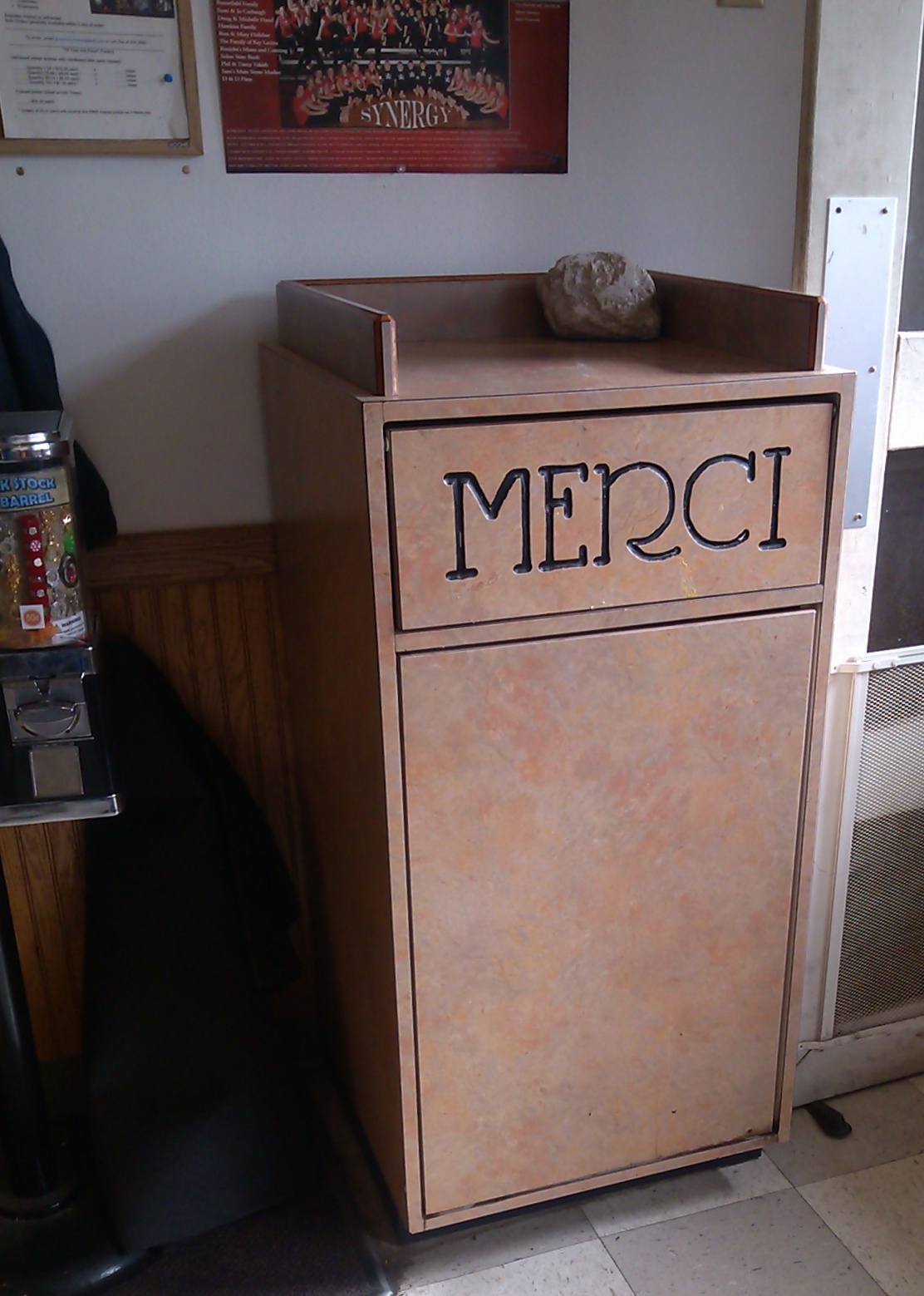 The decor is sports schedule posters tacked up on the walls, with beer advertisements that appeared to be provided by a local distributor. Perhaps in reference to the cafe part of the name, a trash receptacle had the French word “merci” on it, instead of the expected “thank you.” There is no table service, and the idea is to bus your own.